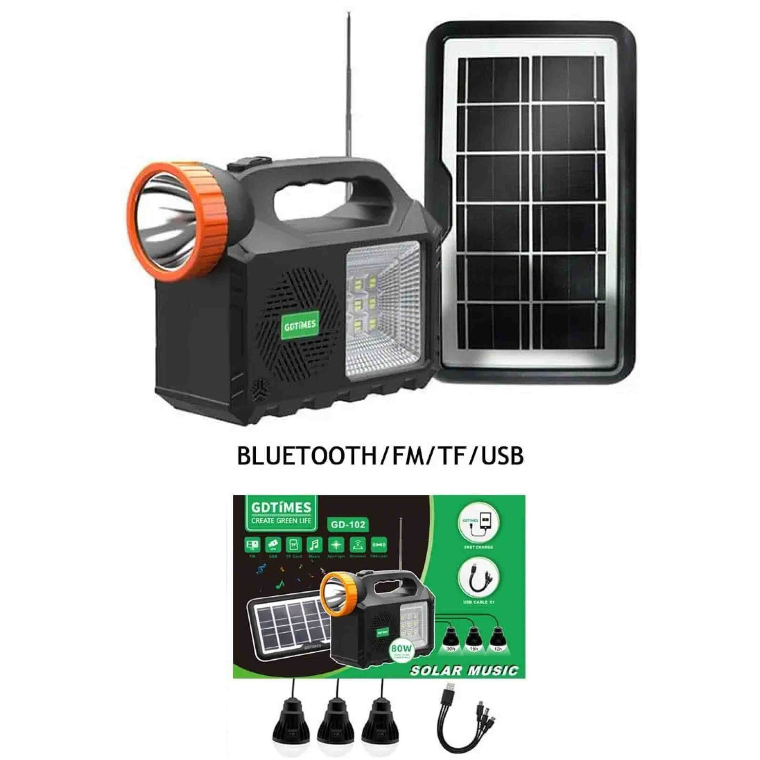LAMPARA LED SOLAR 80W 3200LM 6500K MULTIFUNCION RADIO LINTERNA REFLECTOR Y 3 BOMBILLOS USB 5V «GD-101»
